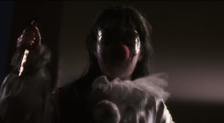 Back at the house, Jamie puts on her clown mask and proceeds to stab her step-mother with a pair of